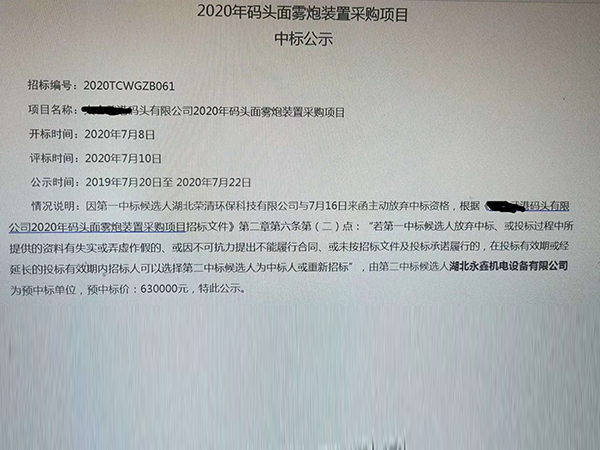 湖北咸阳本千新能源设备有限责任公司(AI智能站)《霧(wù)炮中标(biao)公示》感(gan)謝碼頭(tou)公司對(dui)我們産(chǎn)品的認(rèn)可與信(xin)🥵賴🔅,我們(men)有幸參(can)入公司(si)的發展(zhan)!合作愉(yú)快📱!...